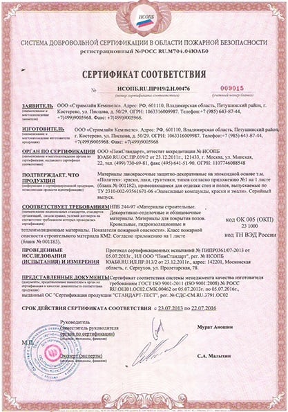 В силу своей искусственной природы и способности основания гореть, ламинат всех классов требует оформления пожарного сертификата. Пожарный сертификат выдается территориальным органом МЧС на основании проведенных испытаний и подтверждает, что сертифицируемый товар соответствует требованиям пожарной безопасности.