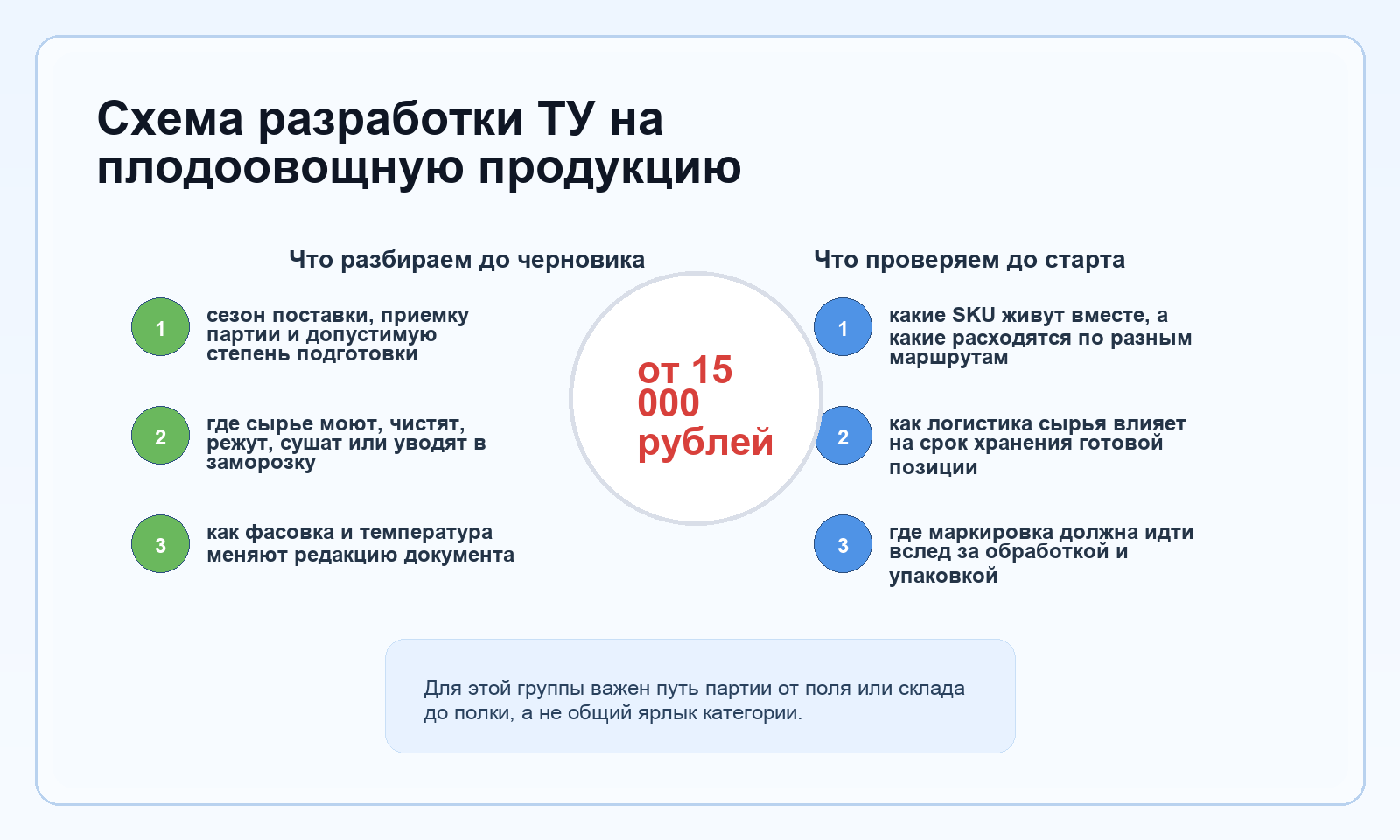 Поэтому в технических условиях мы обязательно фиксируем степень подготовки сырья, допустимые операции с партией, параметры фасовки, условия хранения и привязку маркировки к фактическому формату выпуска. Когда эти опоры собраны правильно, документ становится рабочей картой для склада, производства и коммерческого отдела.